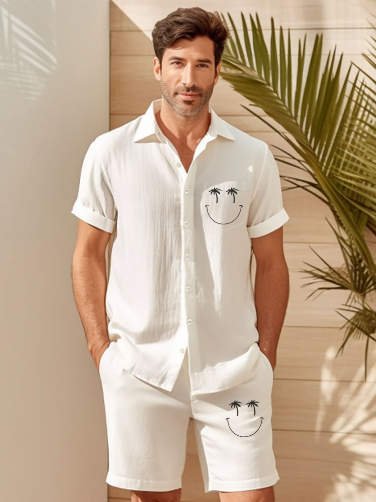 Hawaiian Coconut Tree Smiley Leaf Print Men's Button Pocket Shirt And Shorts Set